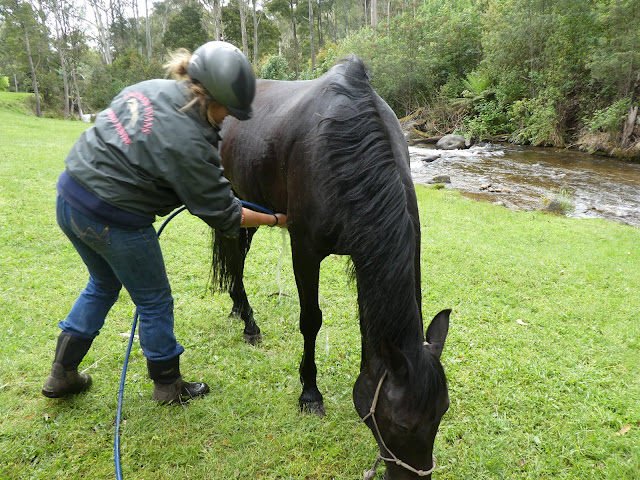 Heading down through mountain ash. Gwen lead us on a couple of good long canters. Loretta's horse fell over on a wet grassy corner but they both got back up and continued on.Giving the horses a drink.